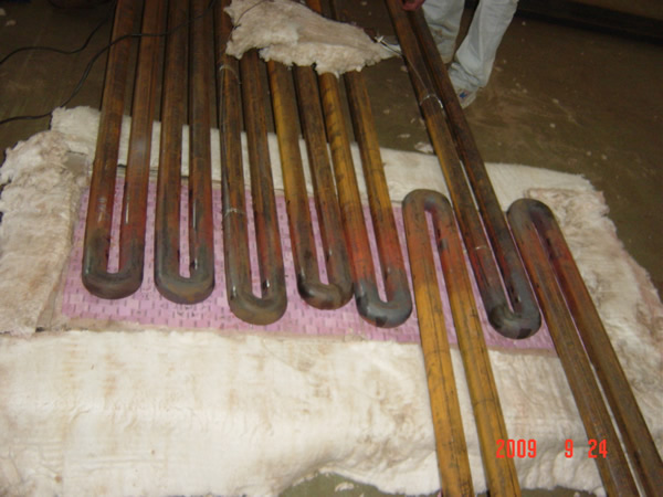 Small R bent tube squeezing and sizing production line is specialized for the fabrication of serpentine tubes for boiler industry. This machine is suitable for the production of small radius single elbow and the secondary bending of serpentine coils. The machine realizes small radius tube bending through the processes of heating, squeezing, and sizing. It is used to squeeze and calibrate small heated elbow on the same level. A qualified 180”ćelbow of Ф=76mm thickness=12.7mm R=1.5D can be squeeze to R=0.6D and achieve technical requirement.